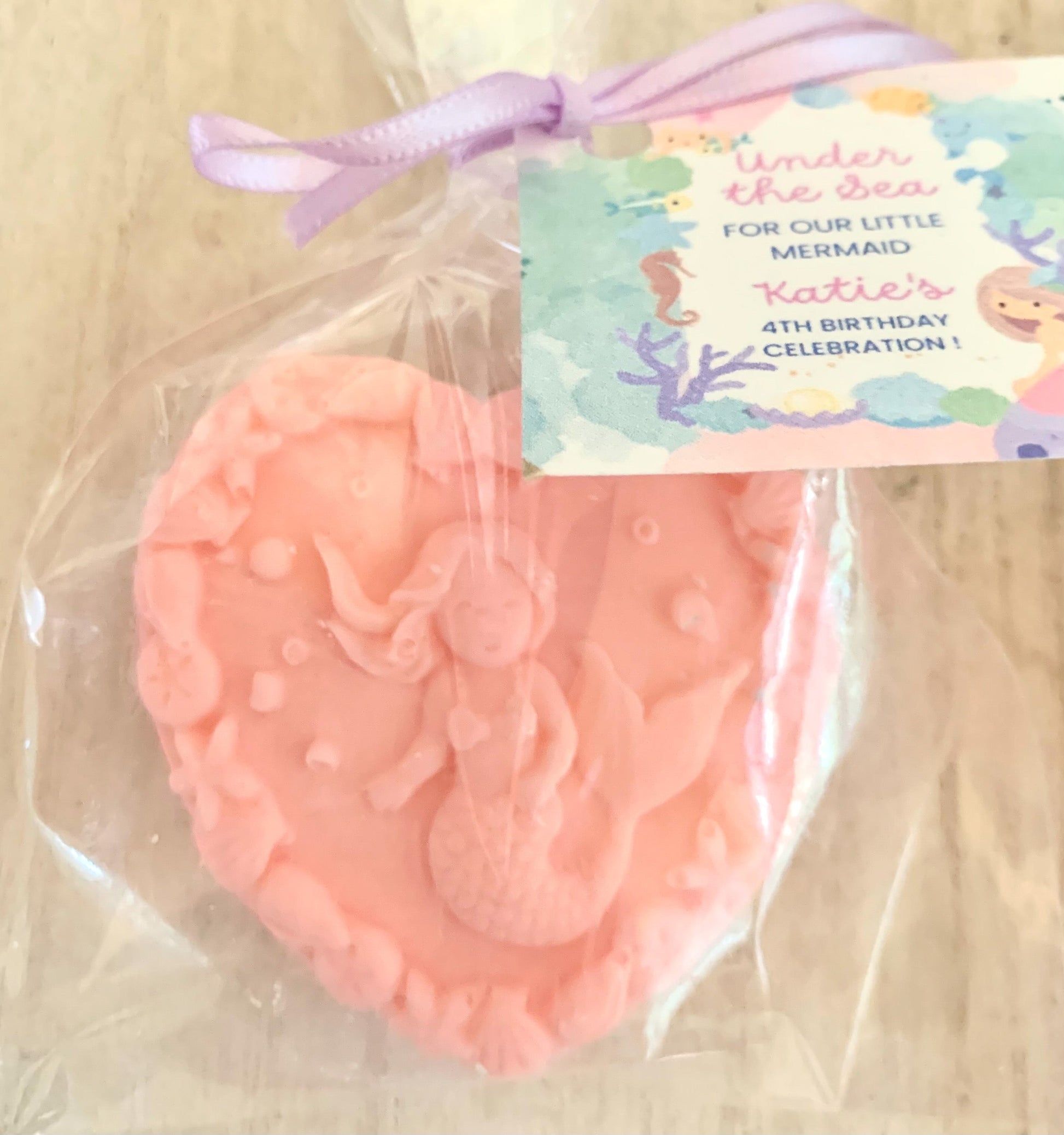 YOU WILL RECEIVE 10 MERMAID Heart Soaps: Each soap will come wrapped in a cello bag, tied with a ribbon and personalized cardstock tag. Please write the personlized wording at time of checkout. If not information is sent, Thank you will be written on the tags.