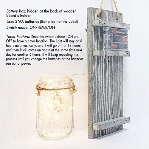 - HANDMADE HOME DECOR - Wall hanging decor jar sconces make the perfect touch of shabby chic to home décor. Whether you want to put them in your hallway, kitchen, near TV, pictures or painting, they will complement your place with a smoothing light that display peace and harmony in your house. Designed with battery operated, could make your own mason jars sconce to a glow home decoration by yourself. Start to experience the creative of design and enjoy the fun.