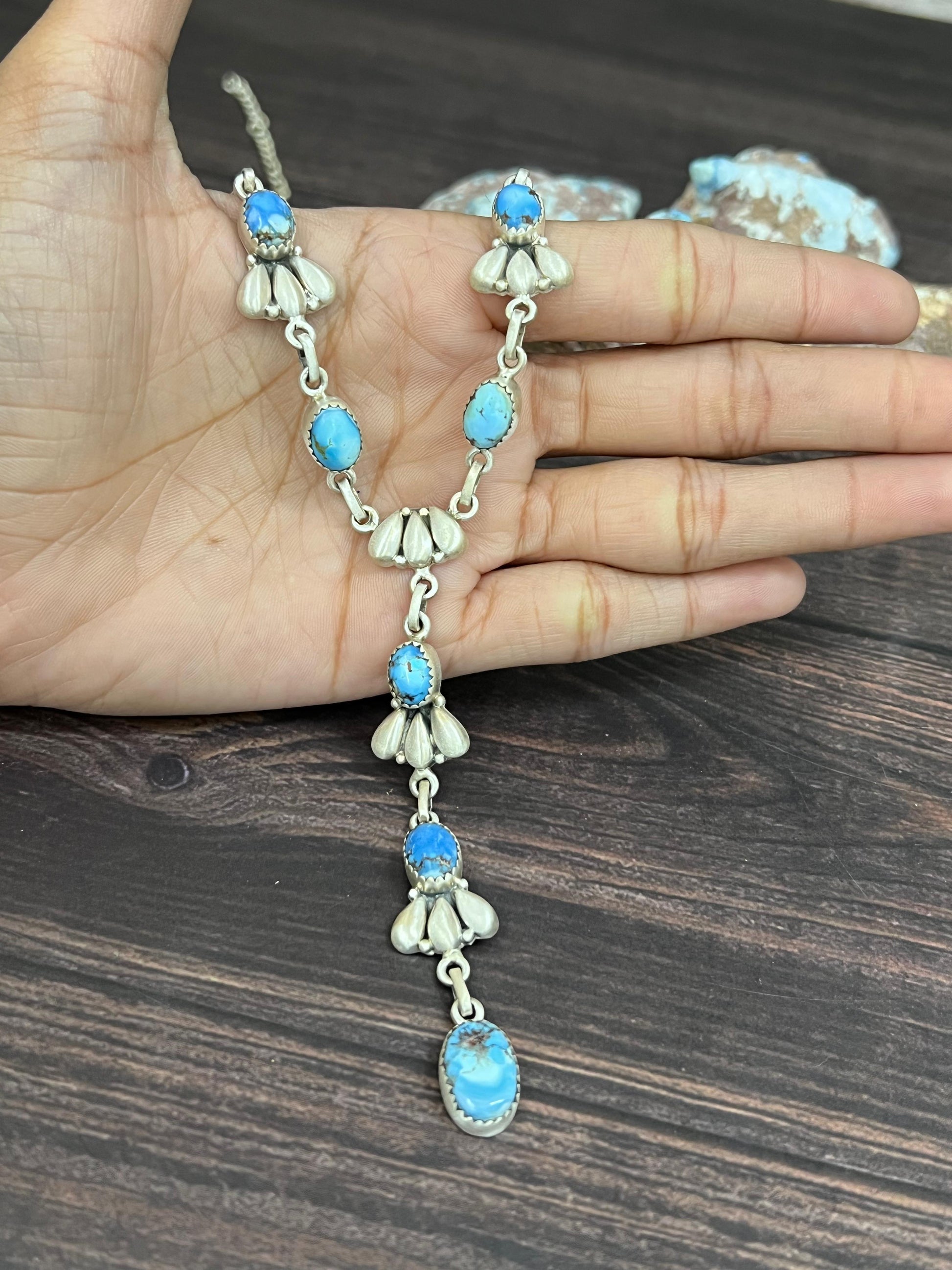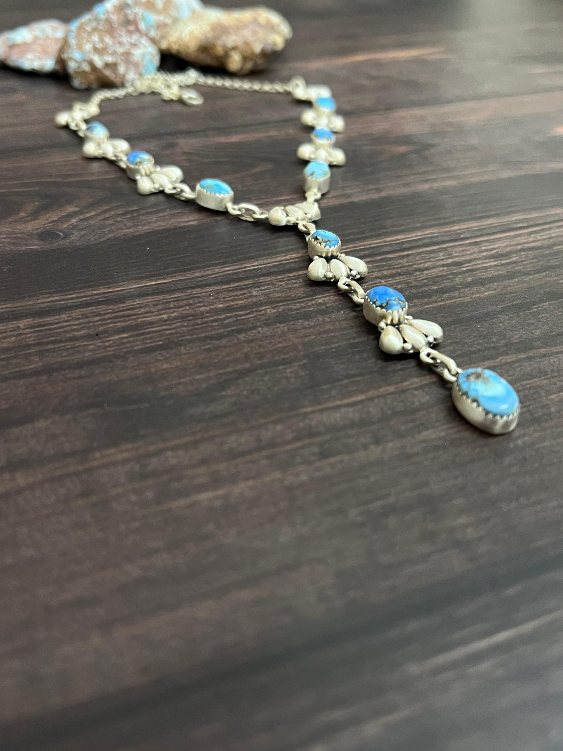 Such gorgeous craftsmanship! Sterling Silver Golden Hills Turquoise Necklace Measures Length 16+2" Extension, Width 6/8" with an additional drop of 3 3/8".