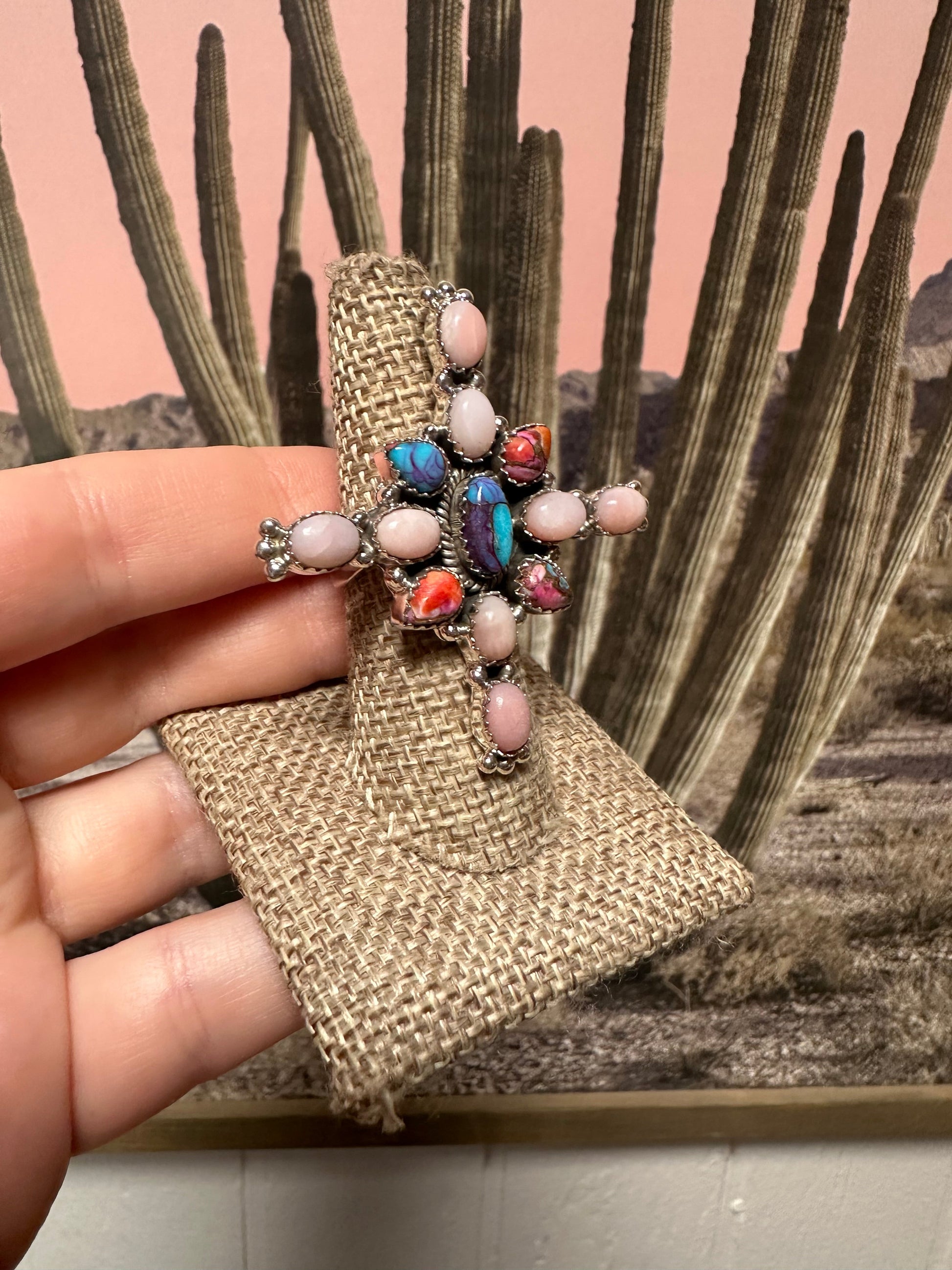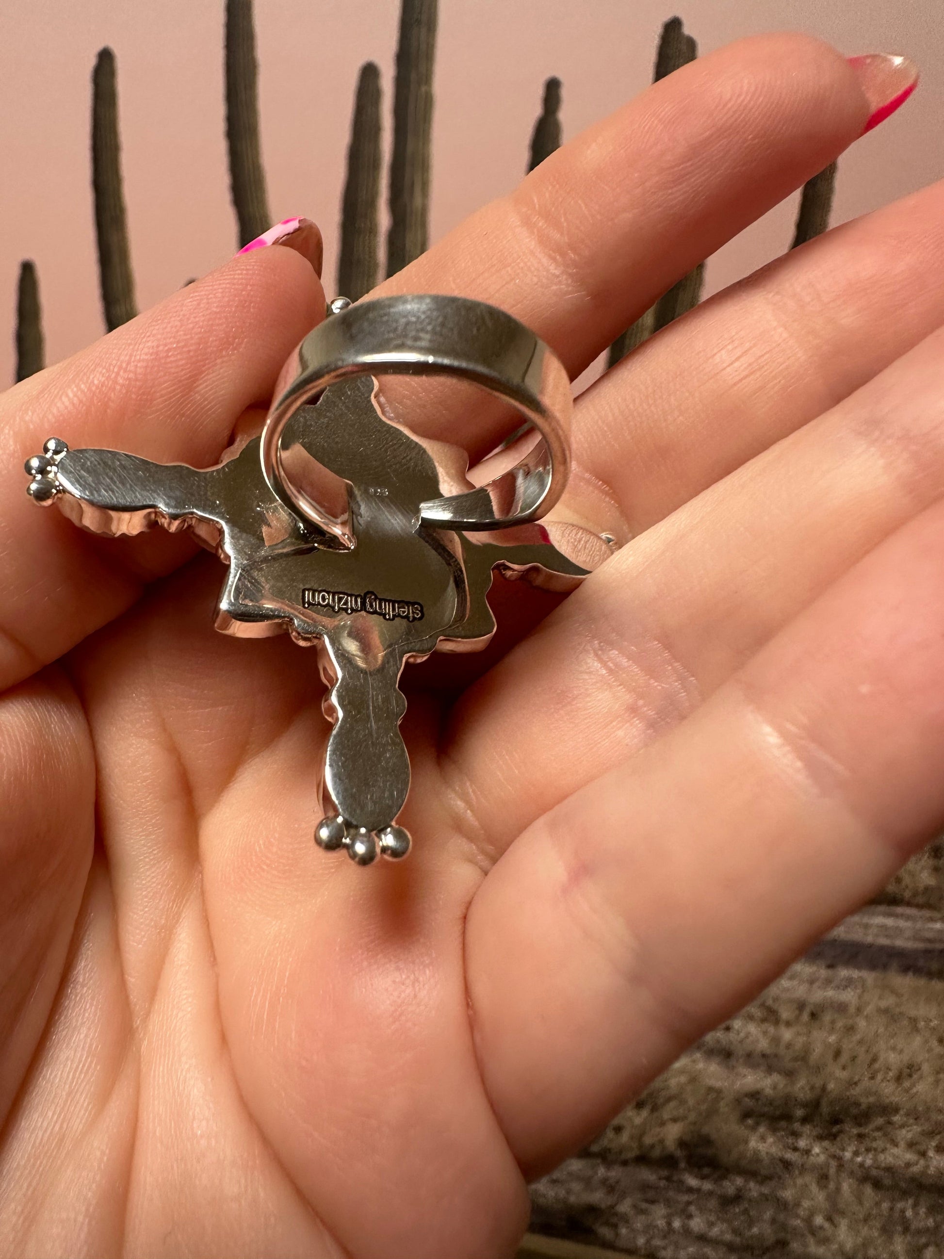Adjustable in size to wear on any finger. Beautiful stones. Beautiful details. Really great Ring. Measuring 2 inch long and 2 inch wide . Signed Nizhoni and stamped Sterling.