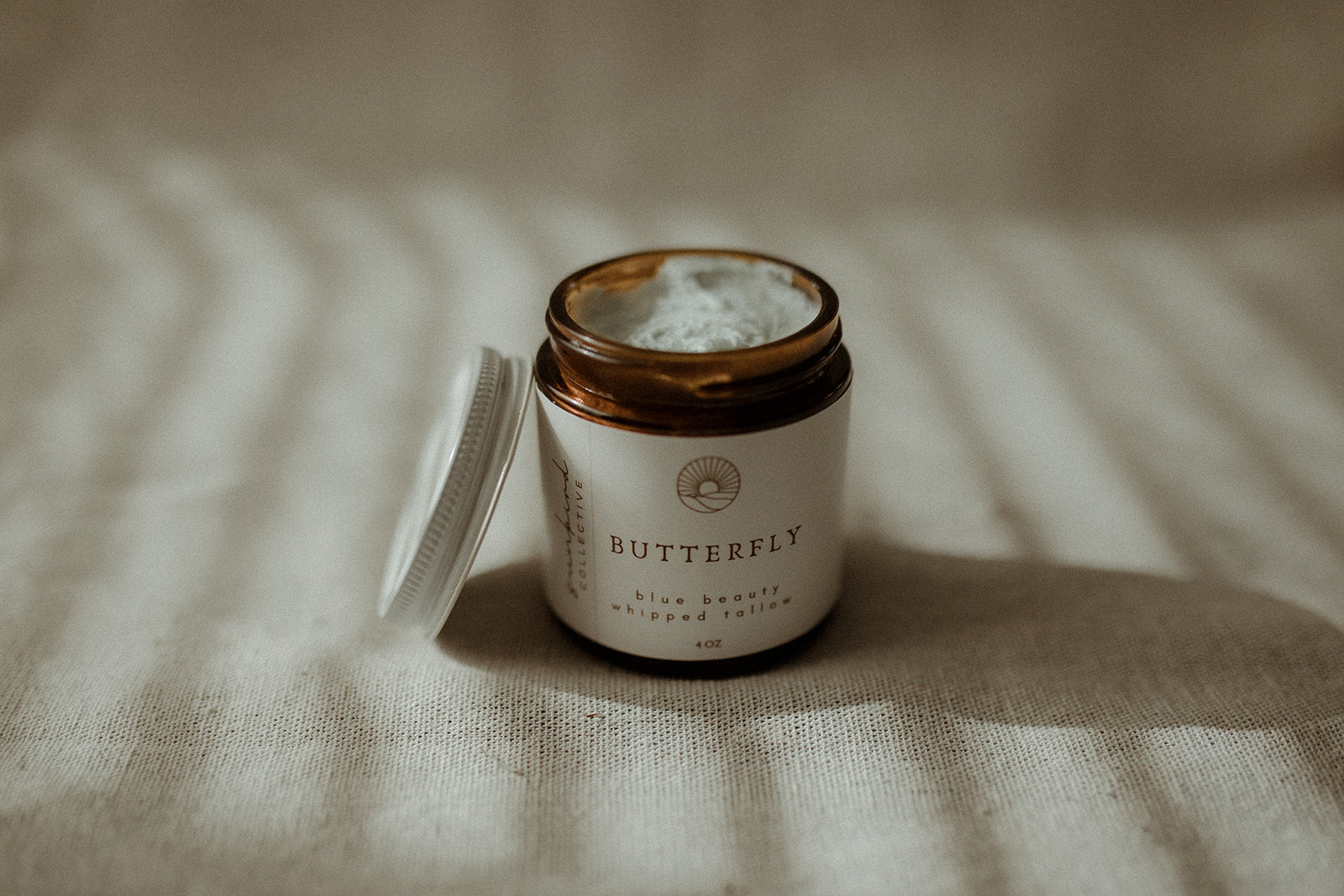 Butterfly is our most delicate facial whip — a pale blue cloud of regenerative grass-finished tallow and golden jojoba oil, infused with butterfly pea flower and Roman chamomile. Blue tansy and German chamomile essential oils lend their calming touch, making this balm a sanctuary for sensitive, reactive, or sun-warmed skin. A luxurious ritual for skin in need of tenderness.