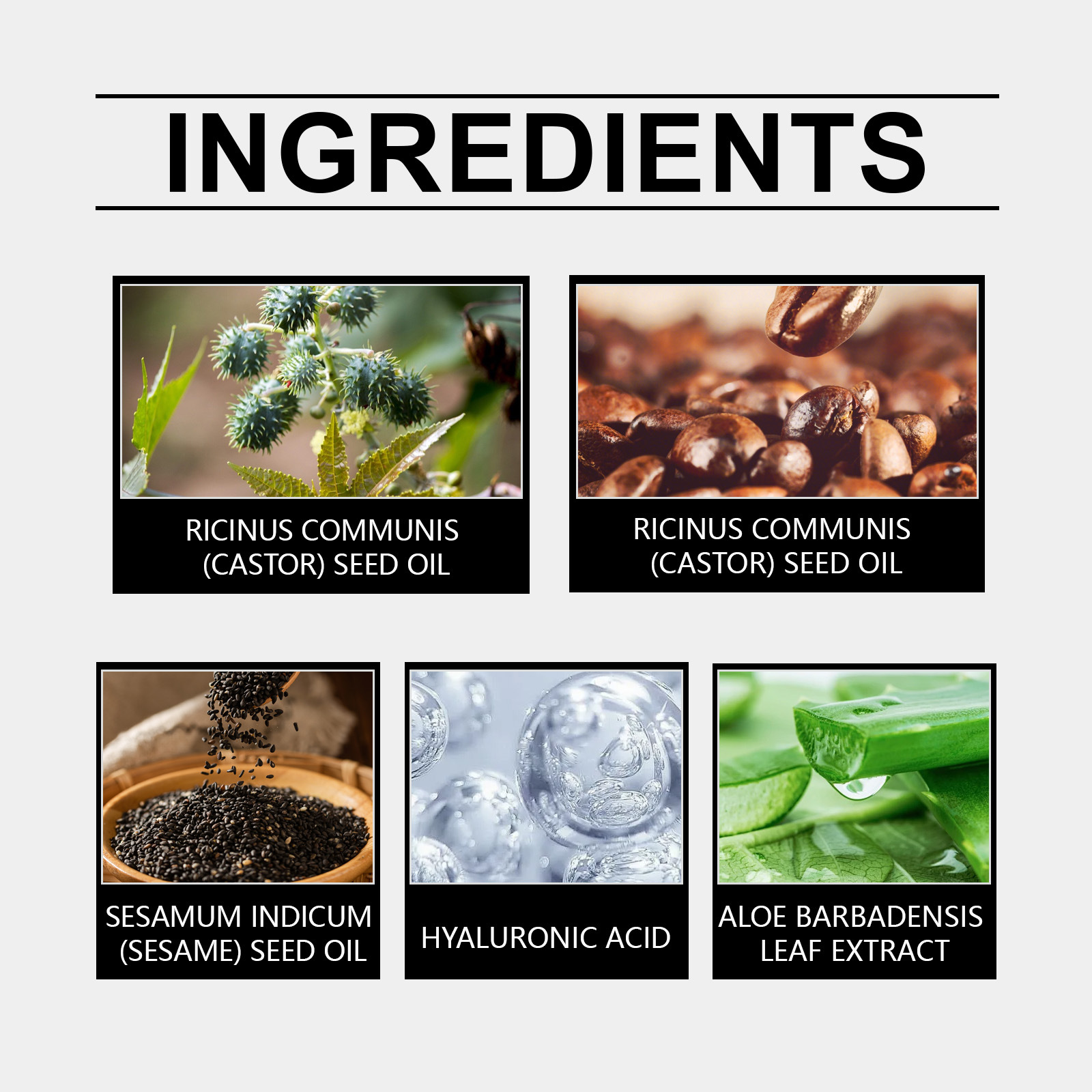 Ingredients: castor oil, coffee seed extract, sesame seed oil, hyaluronic acid, aloe vera leaf extract