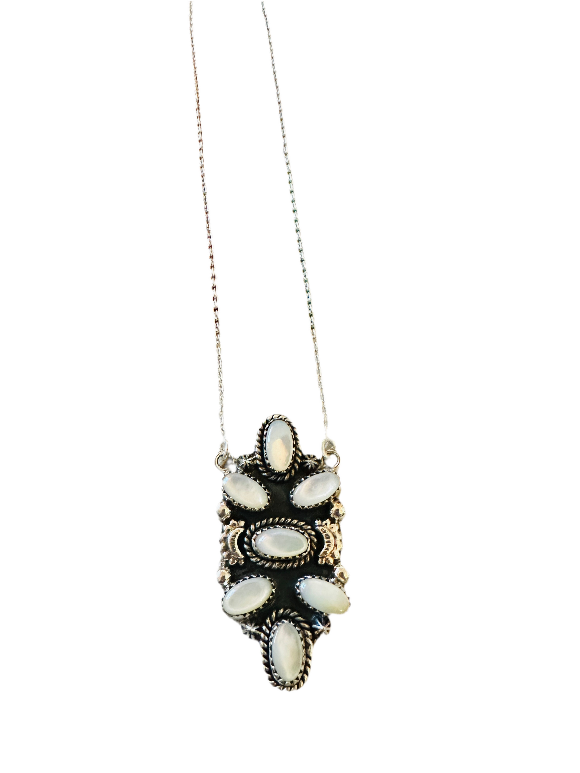 Such gorgeous craftsmanship! Sterling Silver and Mother of Pearl Necklace. Sterling chain measures 16 inches long with a 2 1/2 inch extender. Pendant measures 2 inches long.