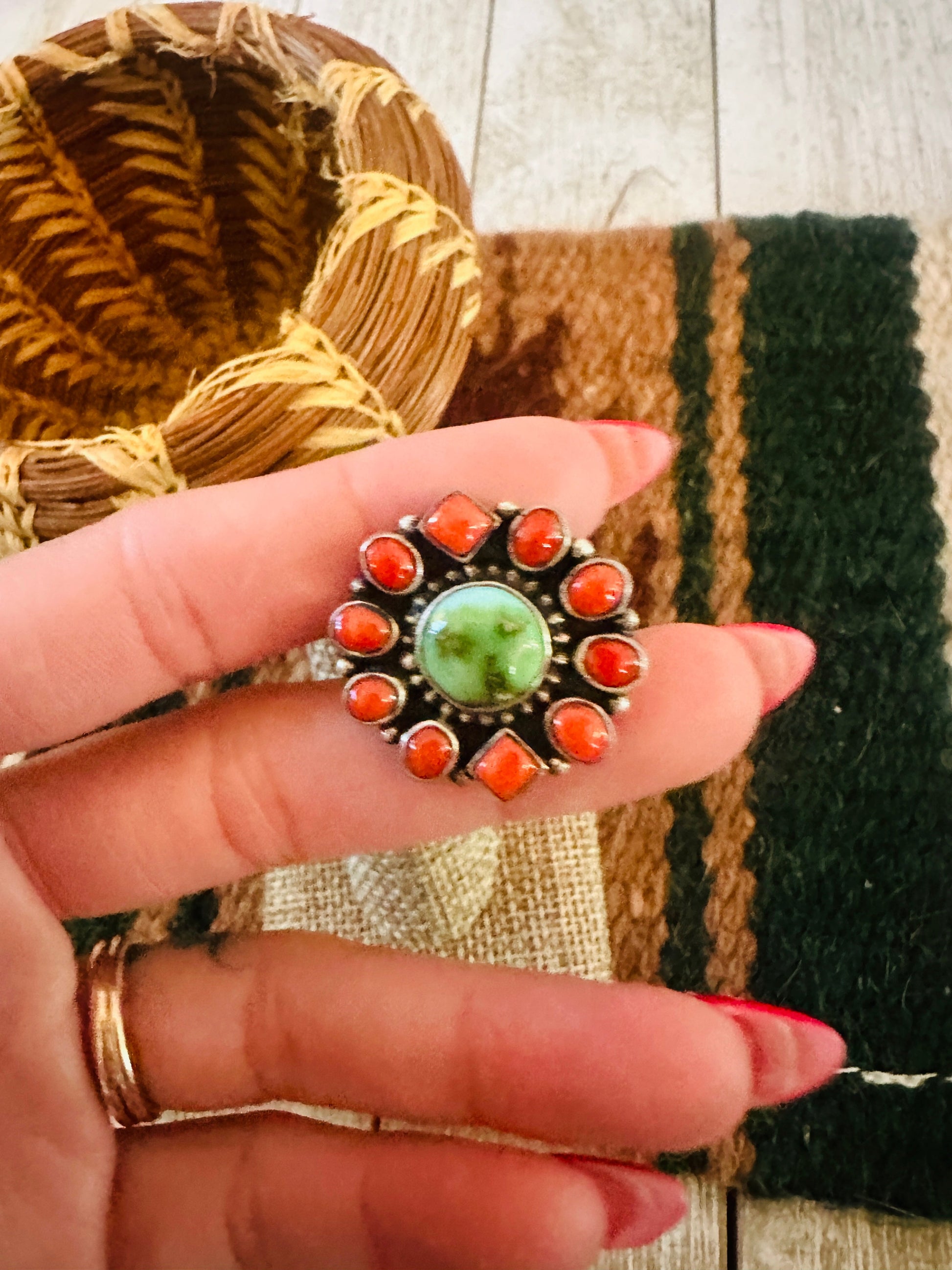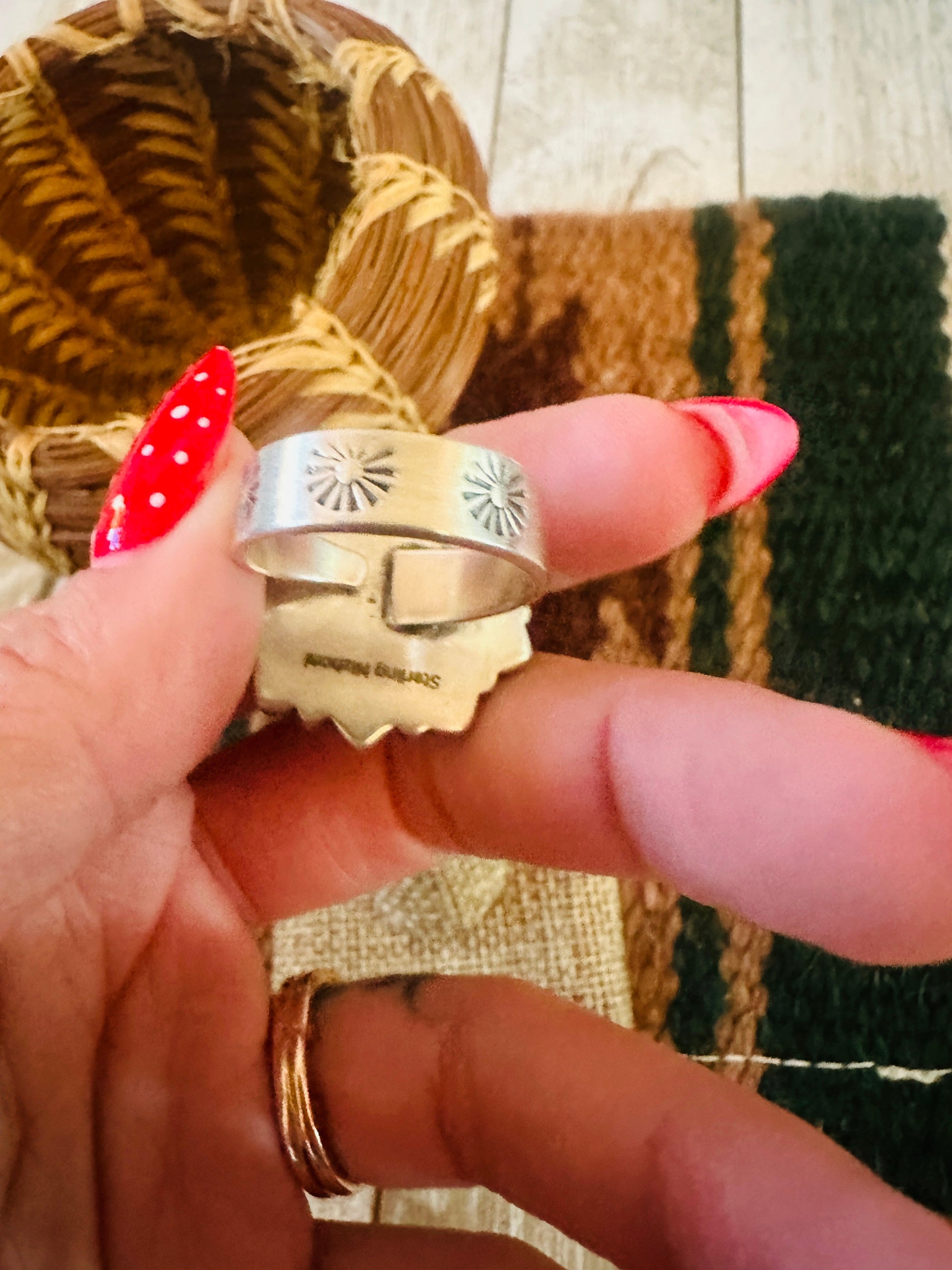 ** Christmas Collection ** Handmade Sterling Silver, Turquoise & Coral Adjustable Ring Signed Nizhoni