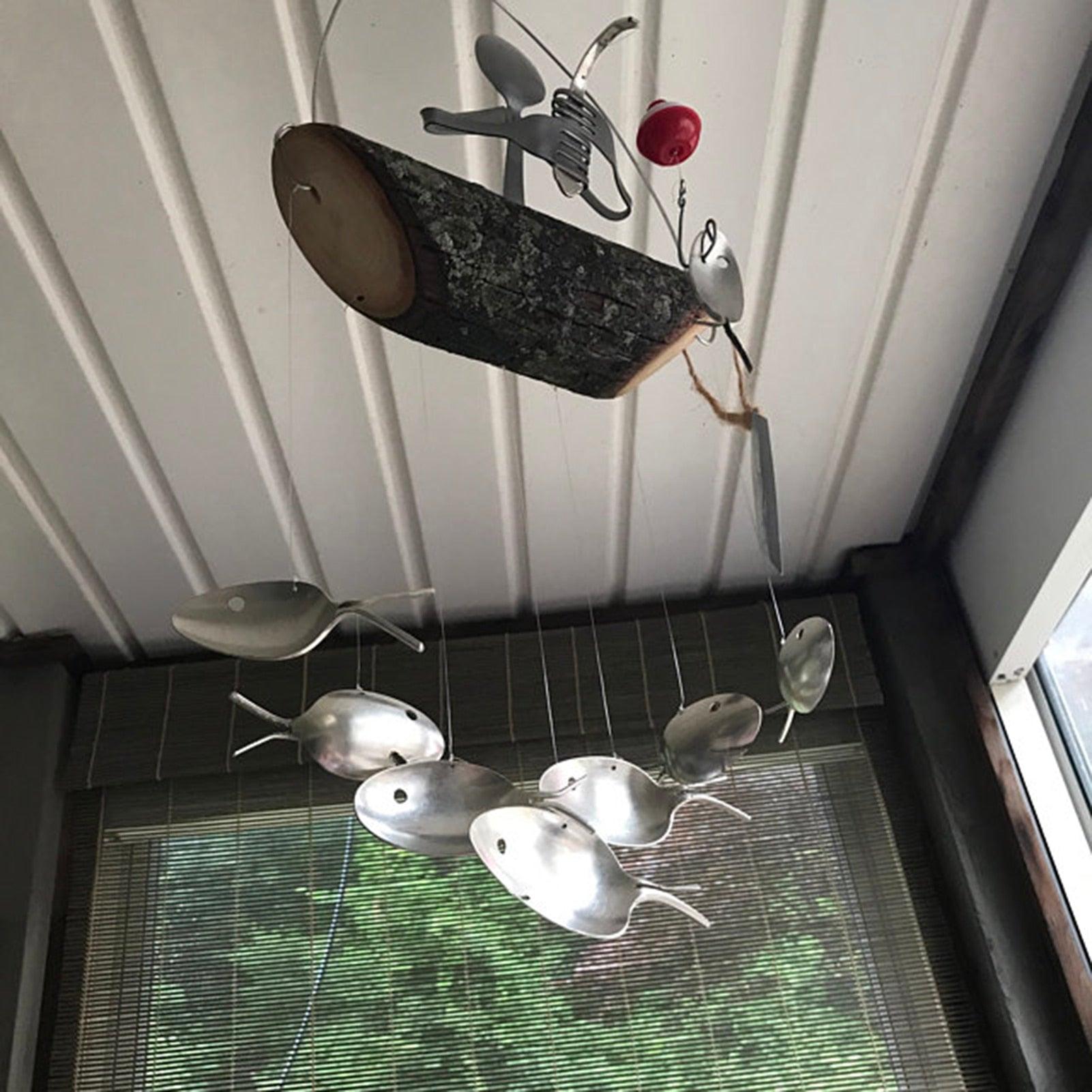 Creative Fishing Man Spoon Fish Sculptures Wind Chime Home Bedroom Painted Fish Mobile Tropical Fish Home Decor Yard Garden Hanging Ornament Decoration