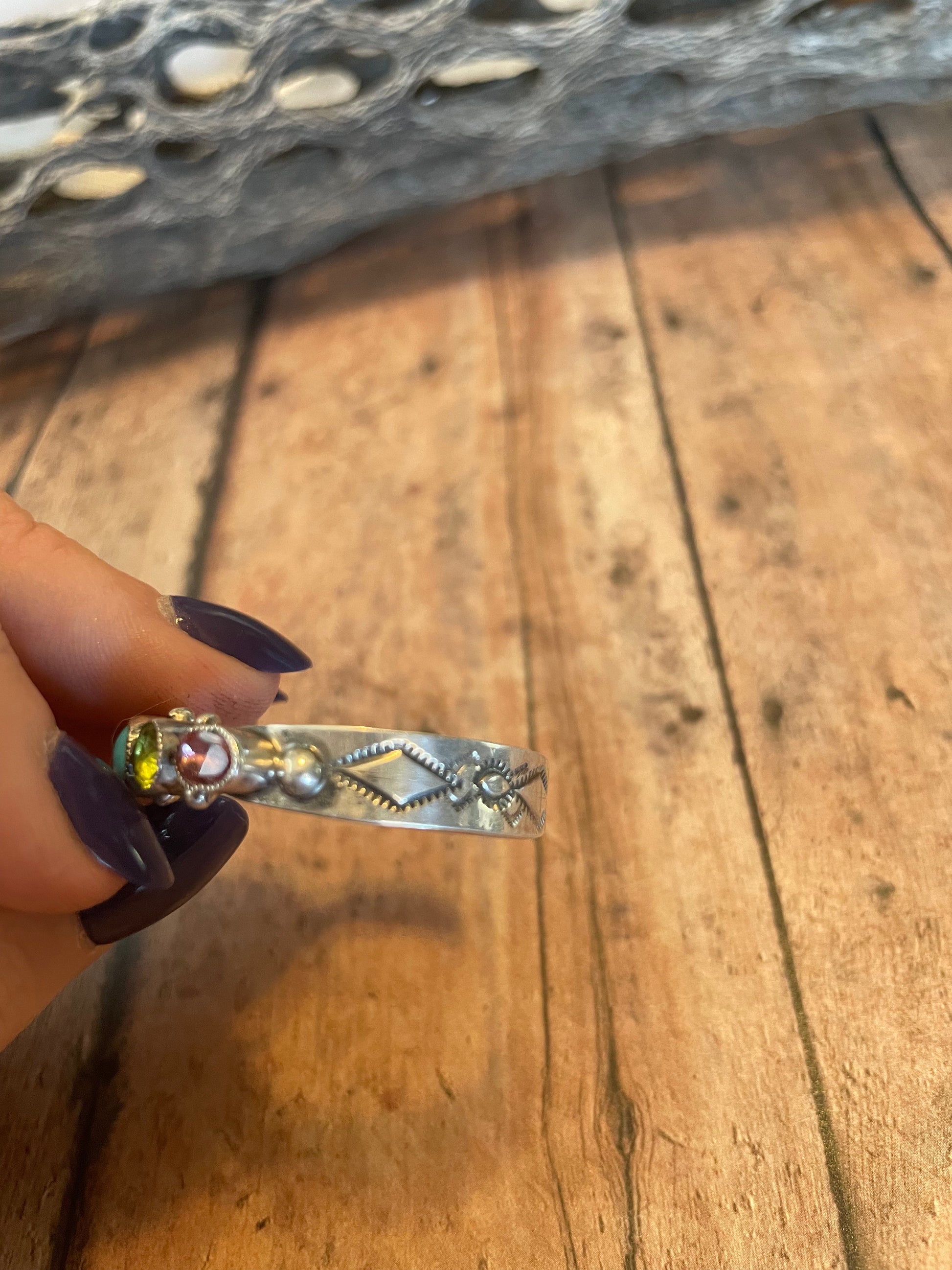 Handcrafted Baby Turquoise And Gem Stone Sterling Silver Cuff Bracelet Signed and Stamped Sterling