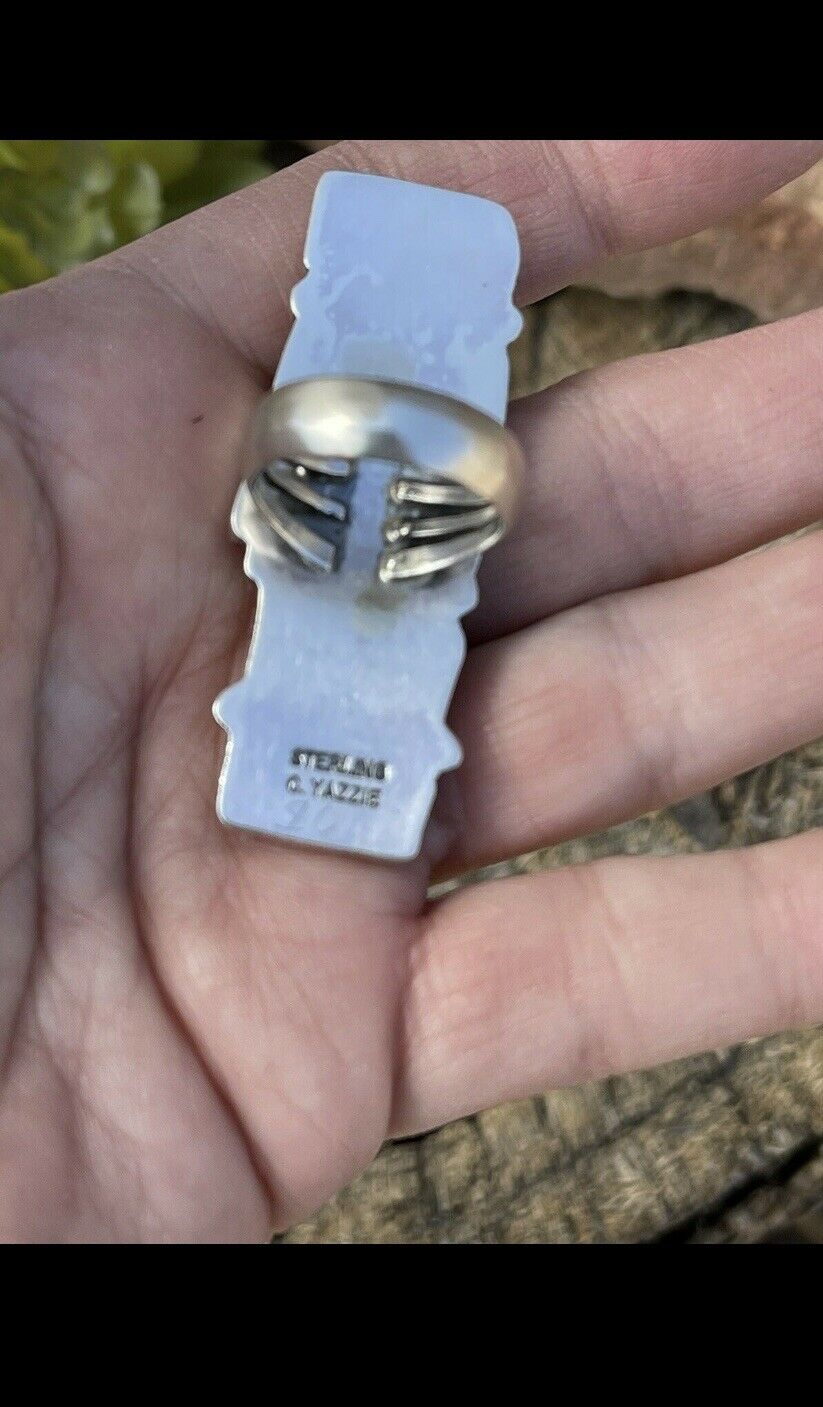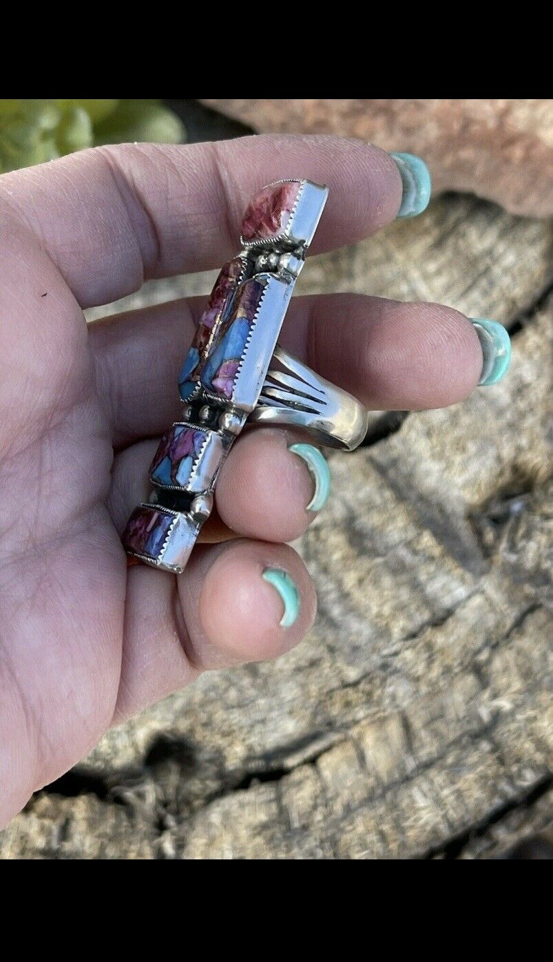 This ring is gorgeous! This Handcrafted Pink Dream Mohave & Sterling Silver Statement Ring. This ring is stamped Sterling and signed by the artist C. Yazzie. Beautiful colors!