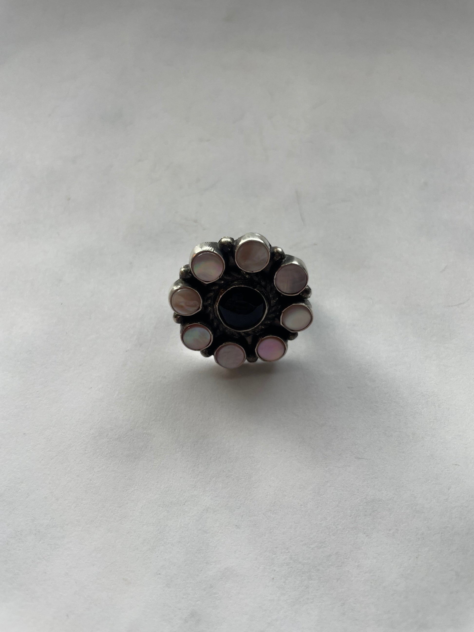 Beautiful Black Onyx, Pink Conch and Sterling Silver Cluster Ring. Signed by the artist and stamped Sterling. Ring face measures just over 1 inch in diameter. Great statement ring! Ring size is adjustable. This listing is for 1 ring only.