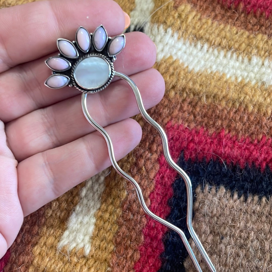 Handmade Mother of Pearl, Pink Conch & Sterling Silver Hair Pin