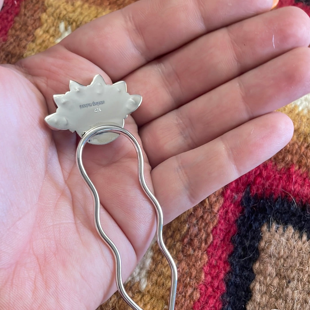 Beautiful handmade Sterling Silver, Pink Conch & Mother of Pearl Hair Pin. Measures 4 1/4 inches long and 1 1/4 inches wide. Such gorgeous stones! Stamped Sterling & Signed Nizhoni. Will vary!