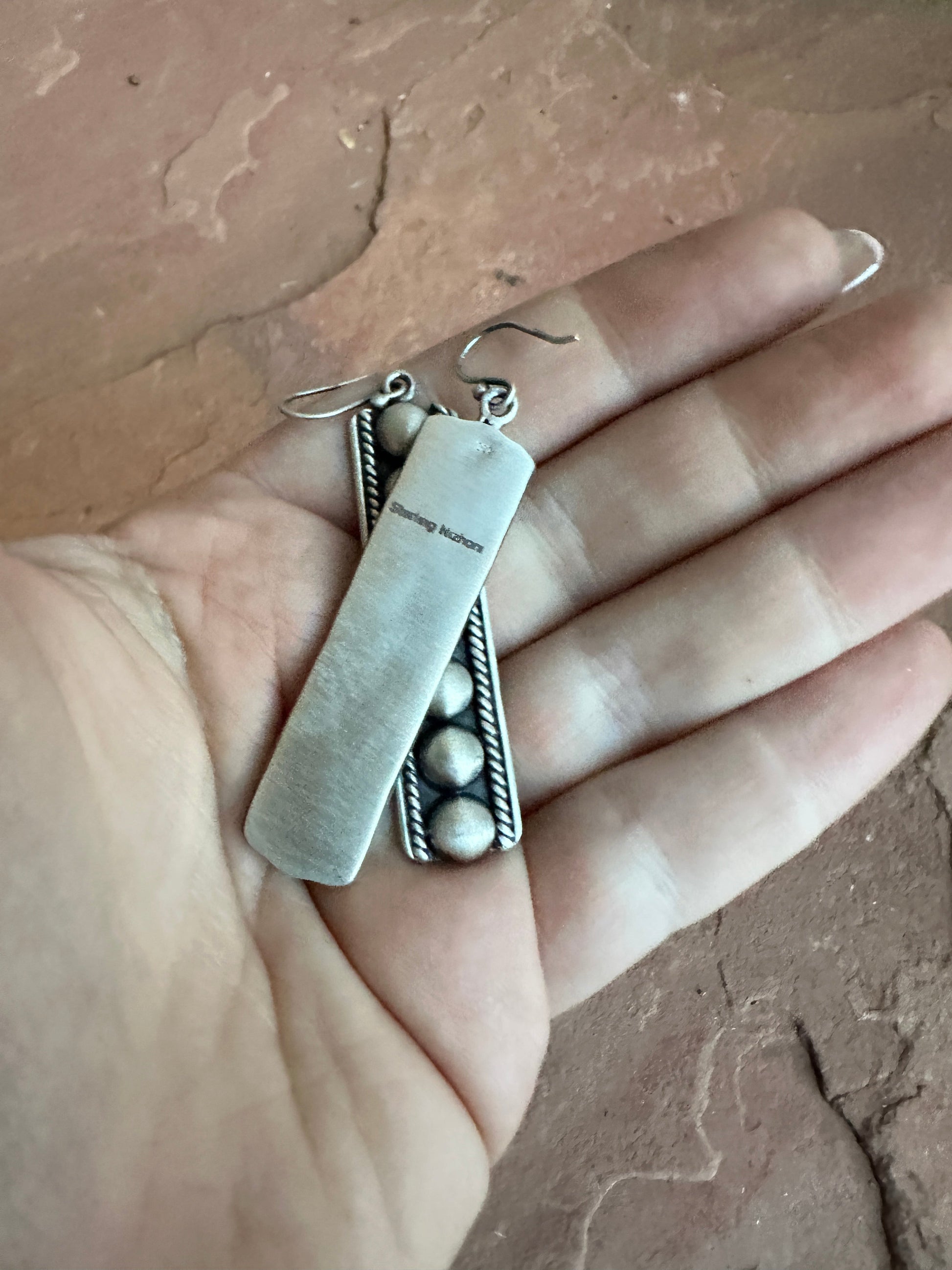 Handmade Sterling Silver Ball Rectangle Hook Dangle Earrings