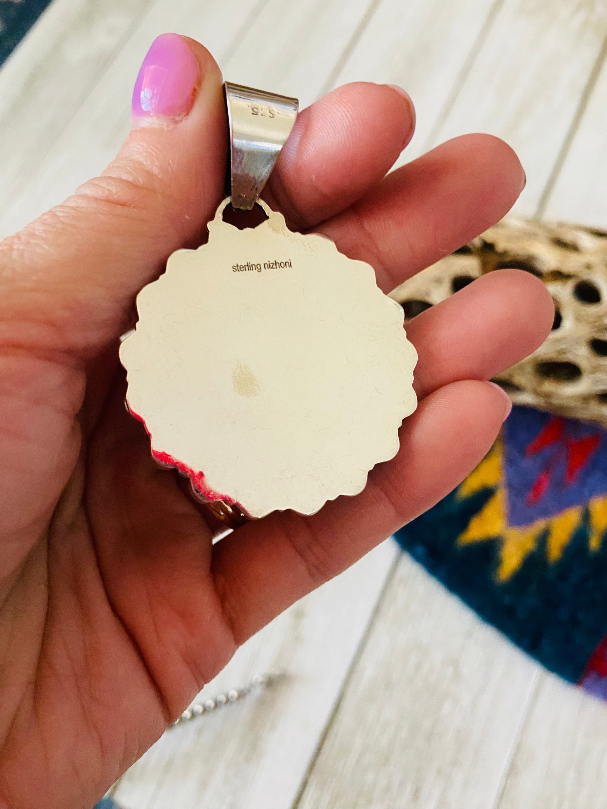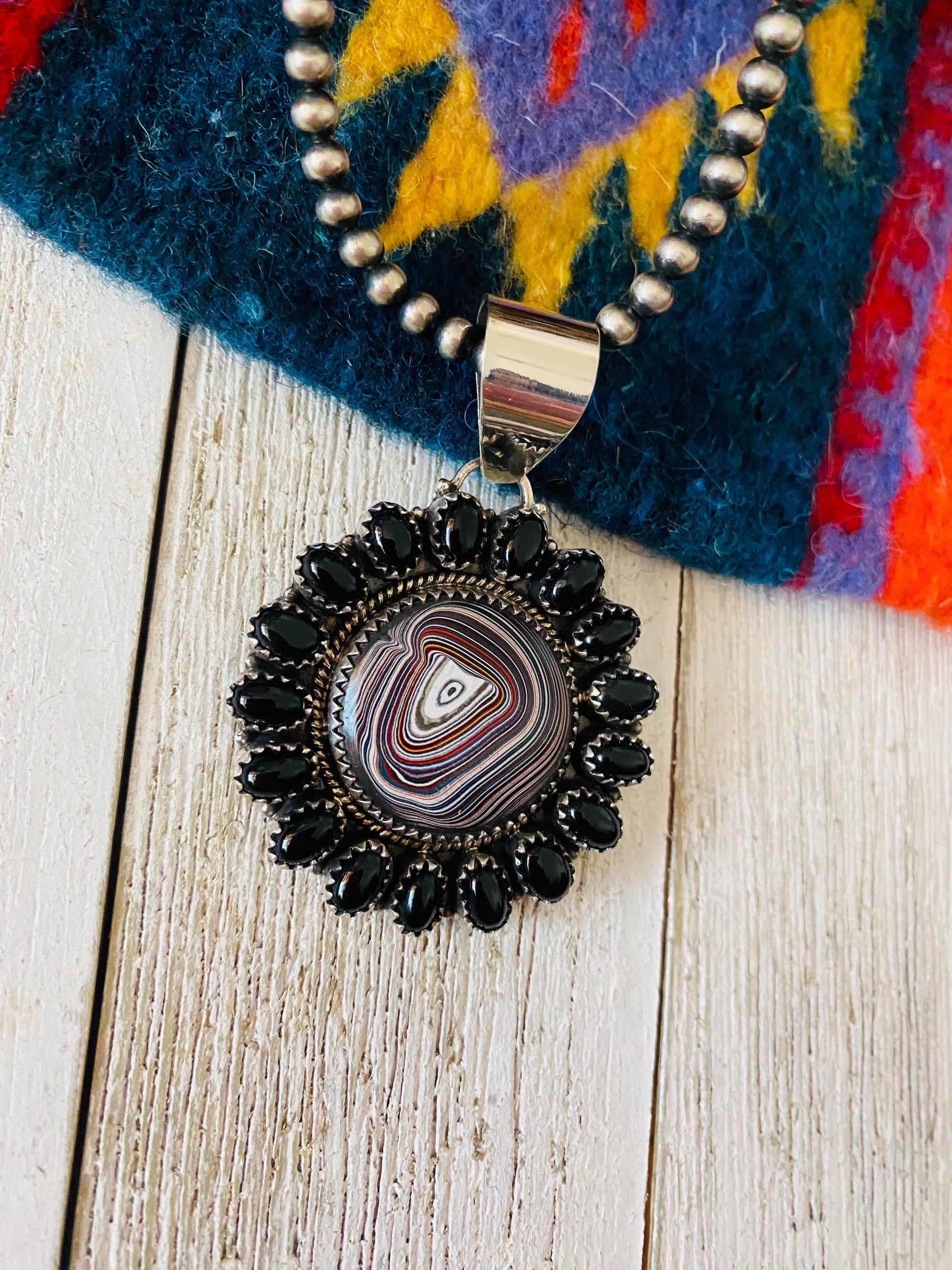 Beautiful Handmade Fordite, Black Onyx and Sterling Silver Cluster Pendant. Such amazing stones in this piece! Pendant measures 2 1/4 inches long and 1 1/2 inches wide. Bale measures just over 3/8 of an inch across. Stamped Sterling and Nizhoni. Pendant only!