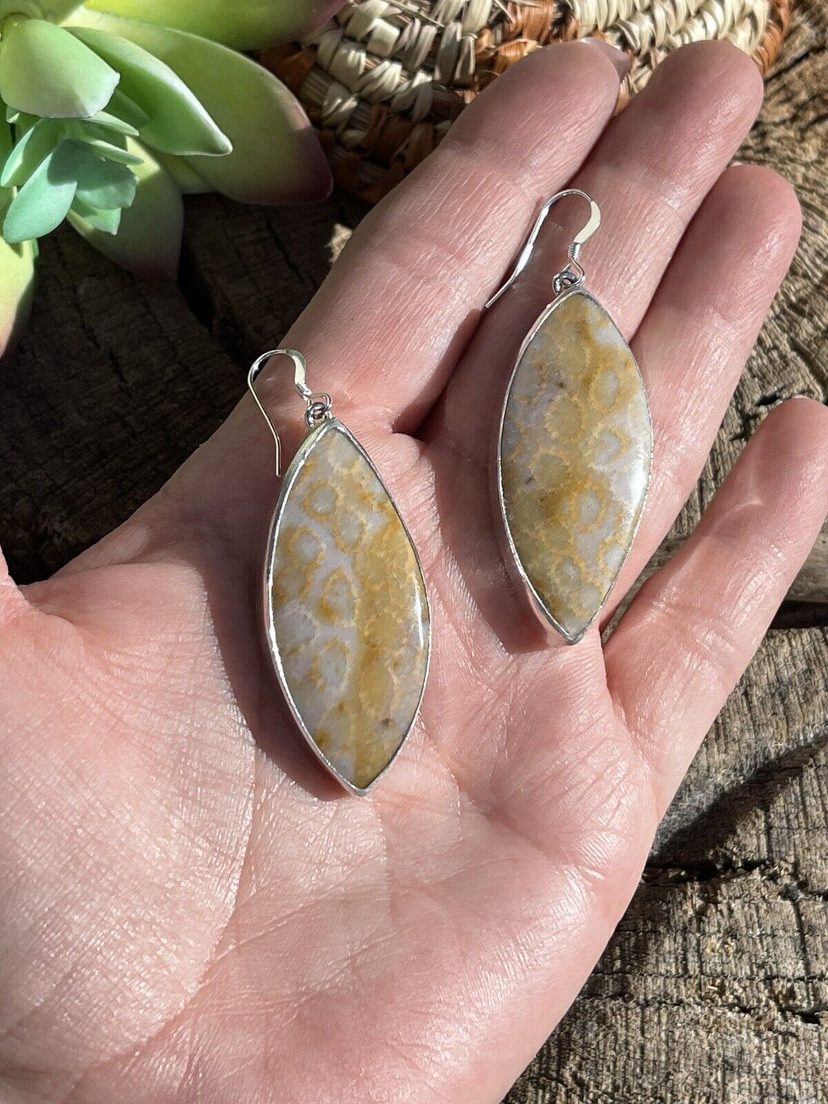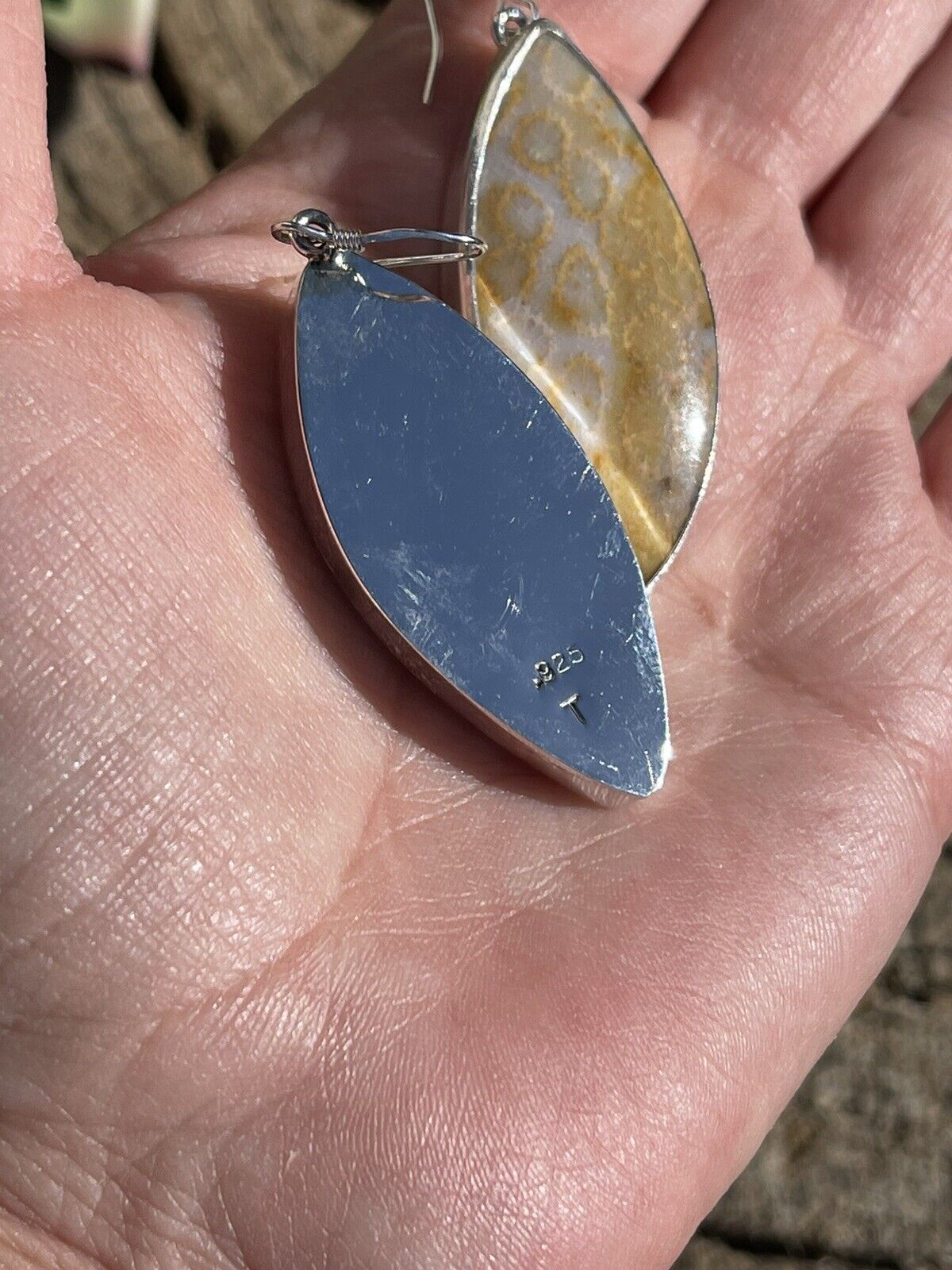 Nature makes such incredible designs. Check out our Beautiful Fossilized Coral & Sterling Silver Dangle Earrings! These Earrings Are Stamped Sterling and Signed By Artist. Measuring 2 1/4 inches long and 3/4 of an inch wide. Such an unique pair of earrings.