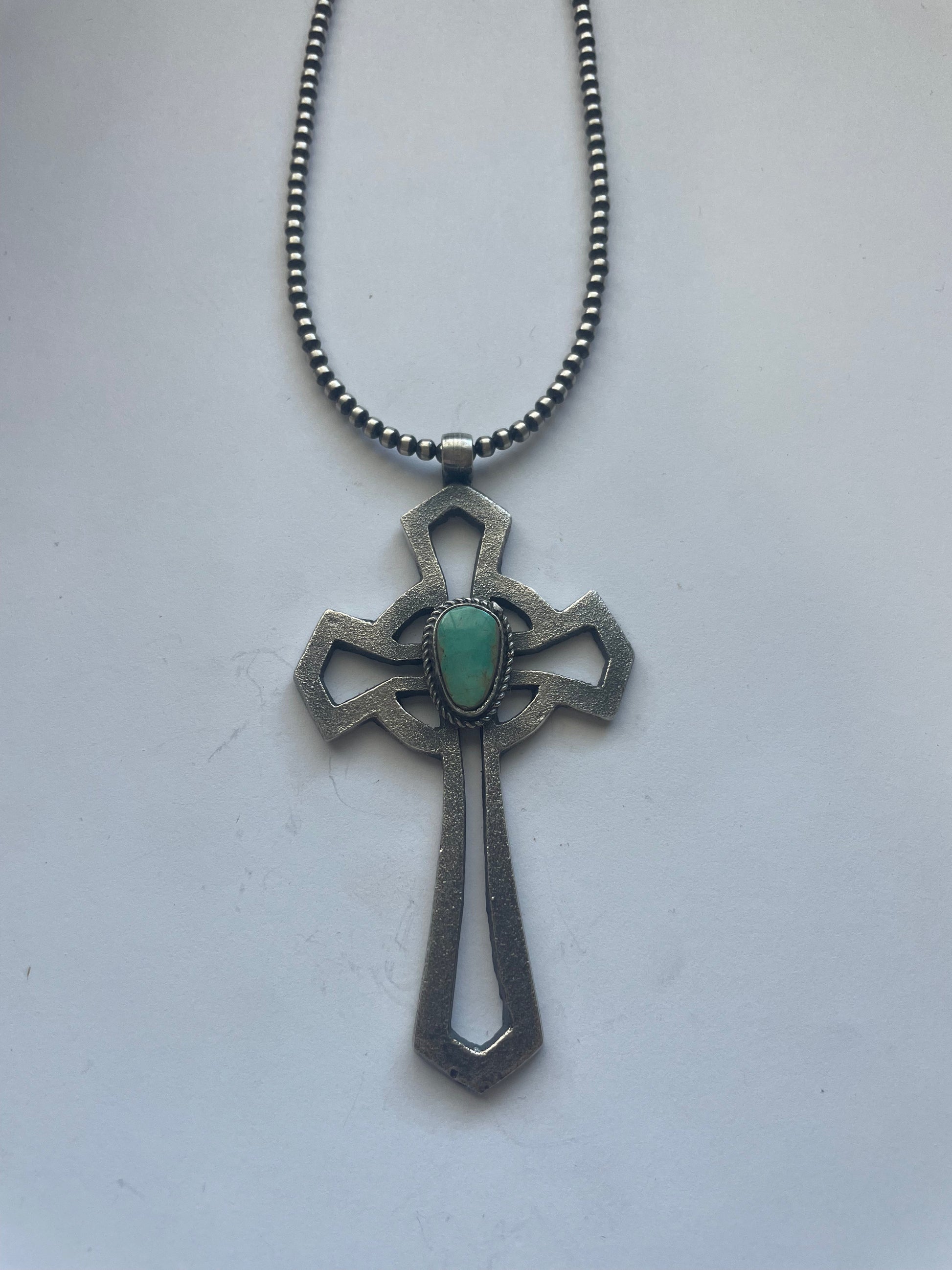 Gorgeous Sterling Silver & Turquoise Cross Pendant. The Cross is 3.5 inches long and 2 inches wide . Cross Pendant only. Stamped Sterling & Signed by the artist Eugene Mitchell.