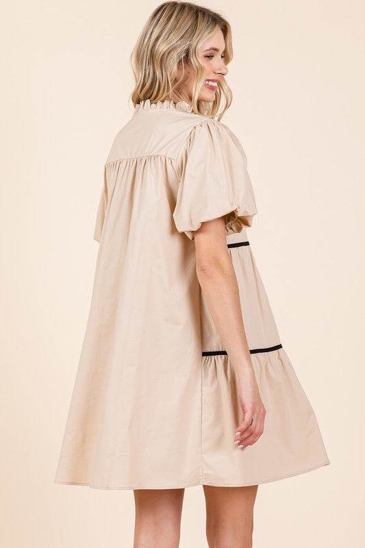 regular size, standard, young contemporary, contemporary, poplin, woven, babydoll, mini dress, short dress, casual dress, piping details, ruffle neck, split neck, mock neck, optional self-tie by the neck, puff sleeve, short sleeve, trendy, cute, stylish, fashionable, comfortable, daily wear, daily look, picnic look, spring, summer, ss, women's clothing, women's apparel, women's wear