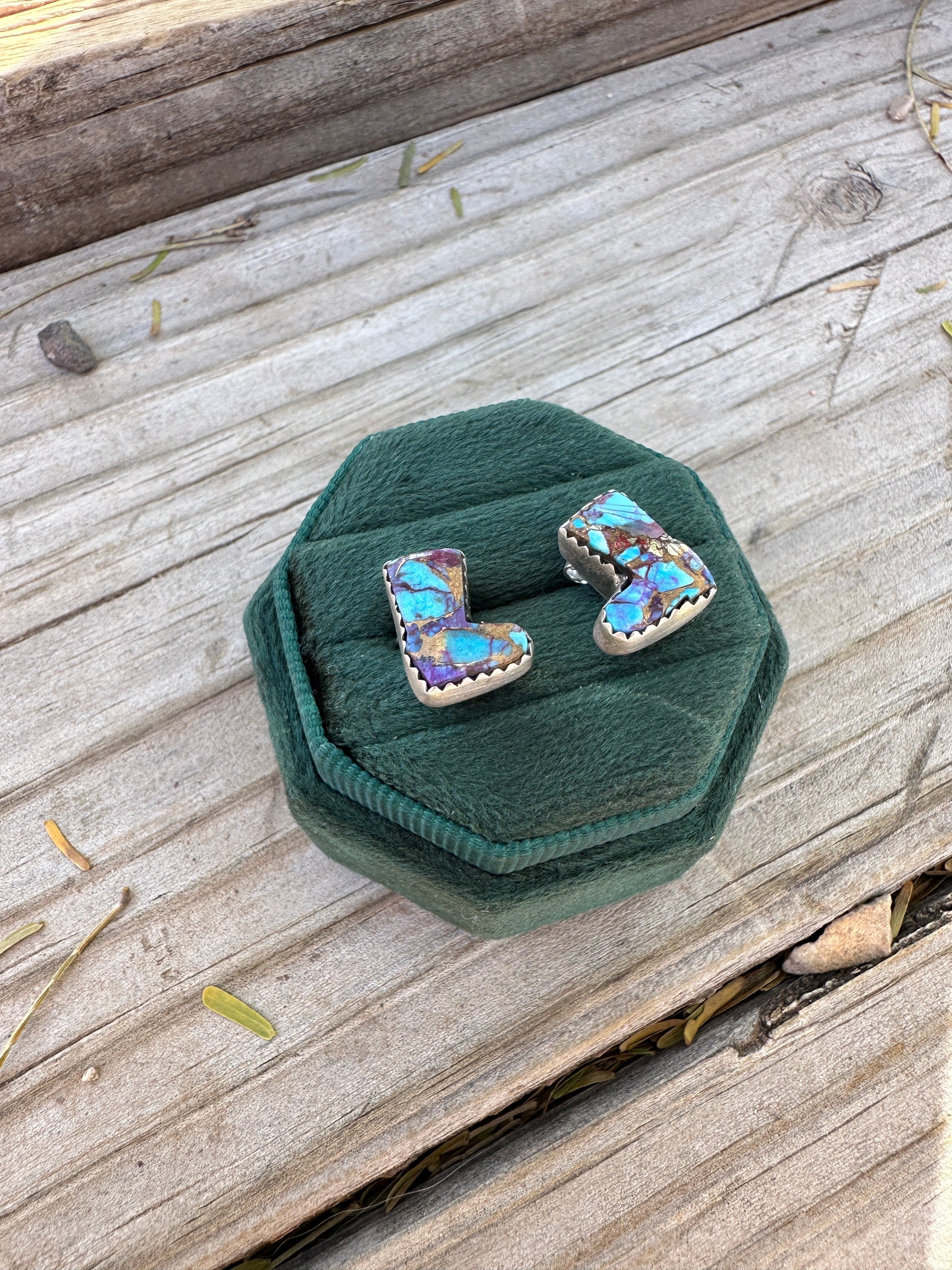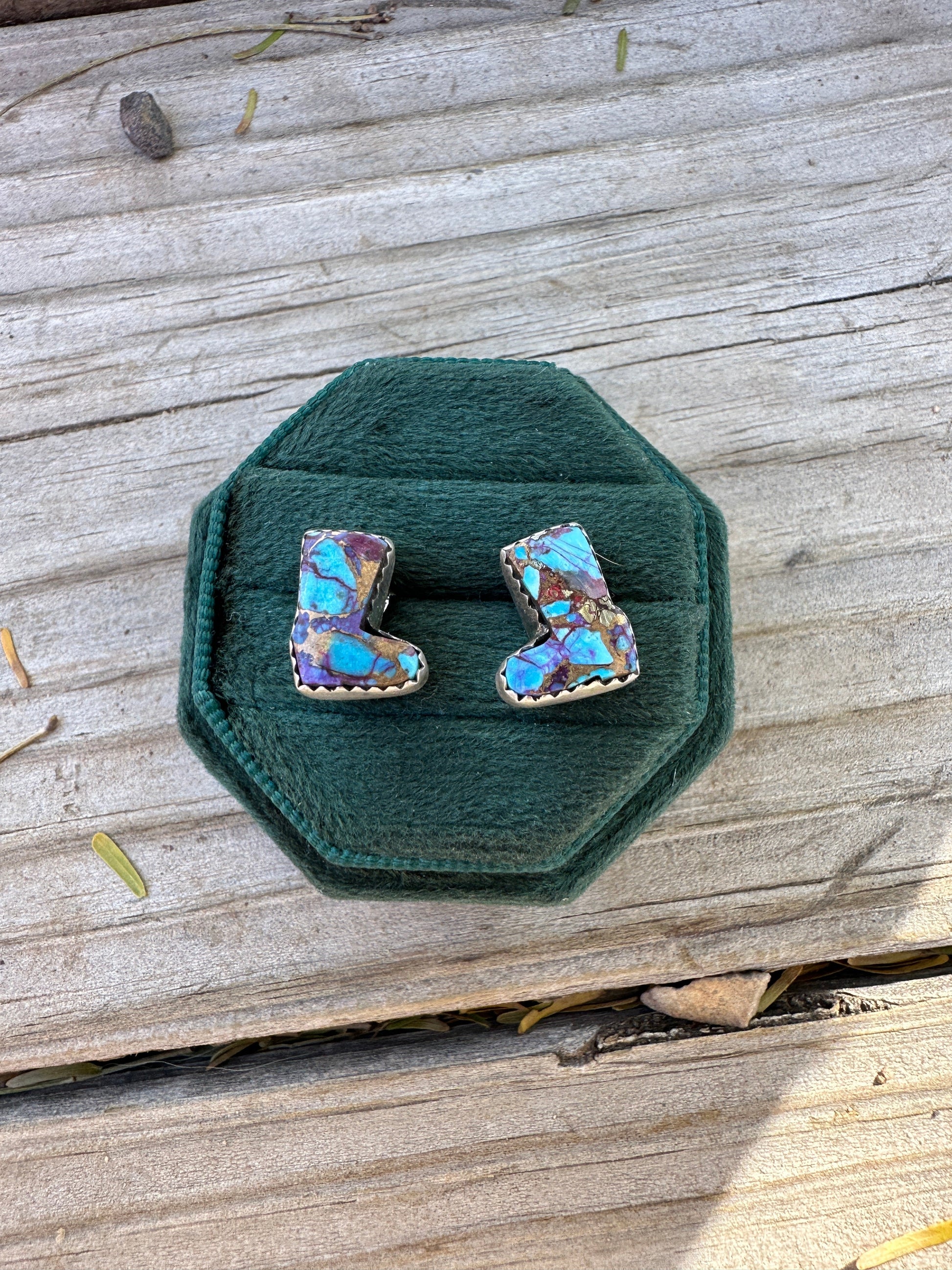 Elegant Handmade Sterling Silver Purple Dream Mojave Boot Post Earrings. Measuring 1/2 inch long and 3/8 inch wide. Signed Nizhoni and stamped Sterling. There are several pairs available and they will vary in color.