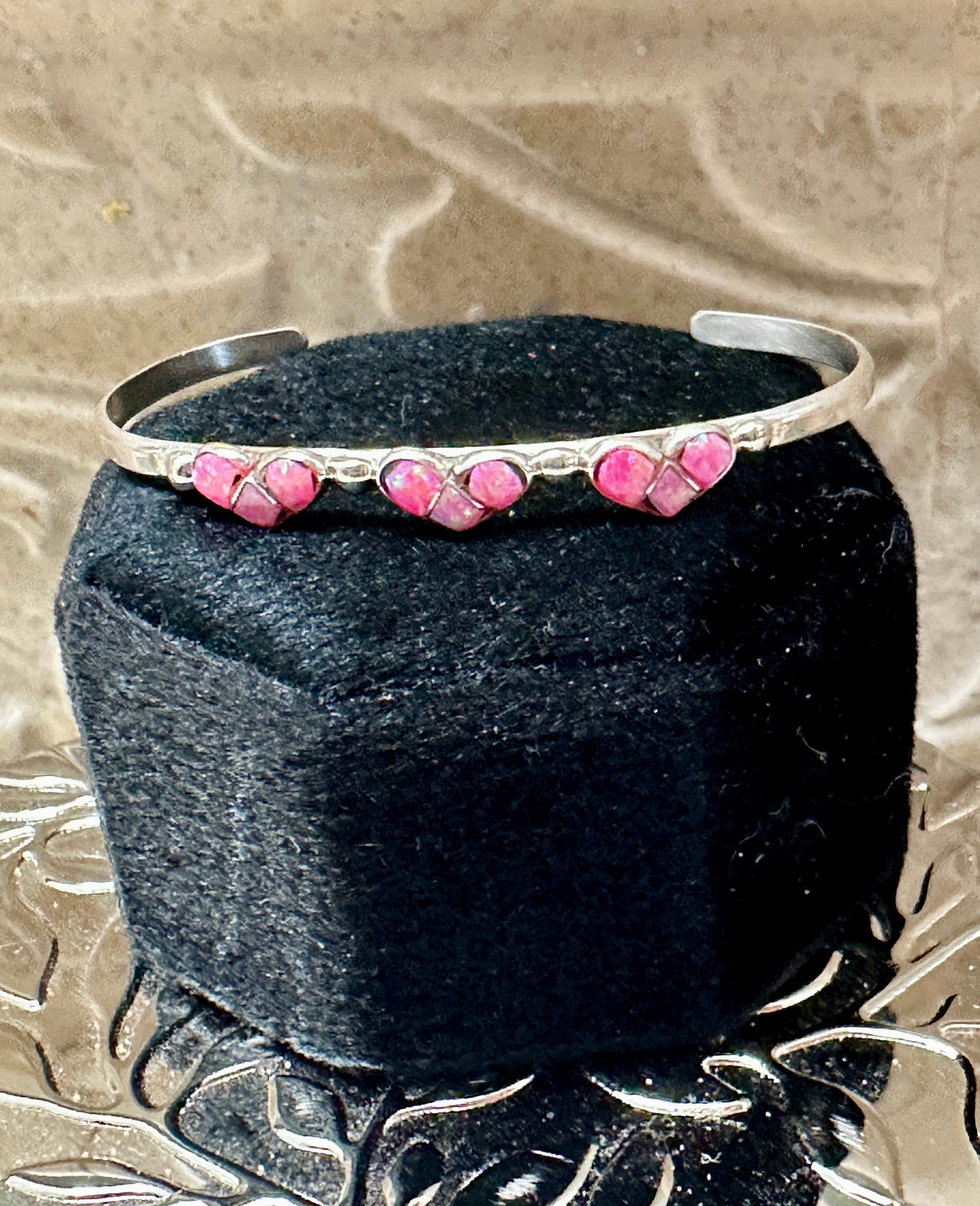 So Dang Cute! Handmade Sterling Silver and Pink Opal Heart Baby Cuff Bracelet. Measuring 3 3/4 inches inside circumference with a 1 inch adjustable gap. Width is 1/8 of an inch. Absolutely adorable. Stones may vary.