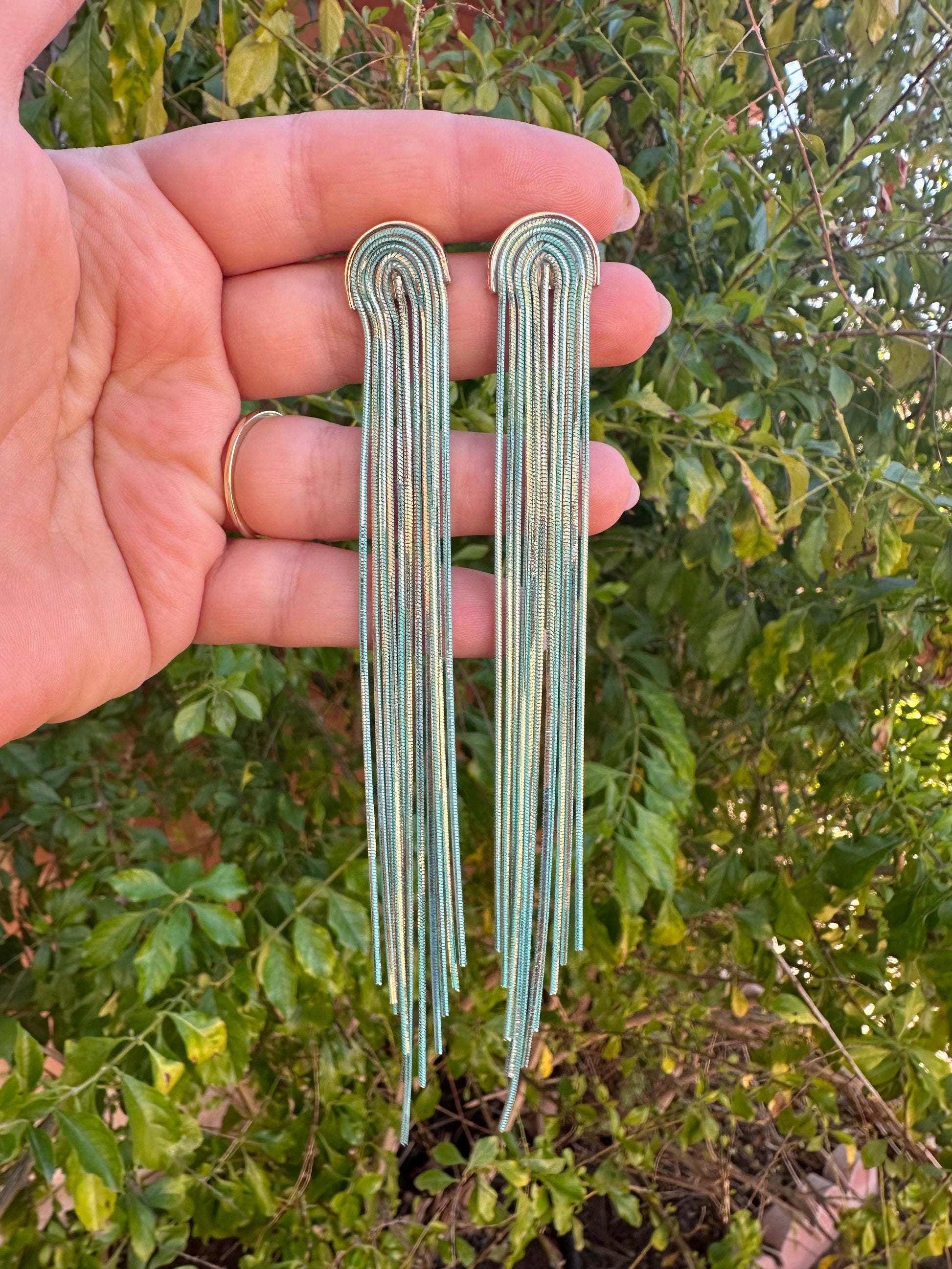 How gorgeous are these Handmade Turquoise & Gold Plated Tassel Drop Earrings. These are lightweight and measuring 6 inches long & 1/2 inch wide!