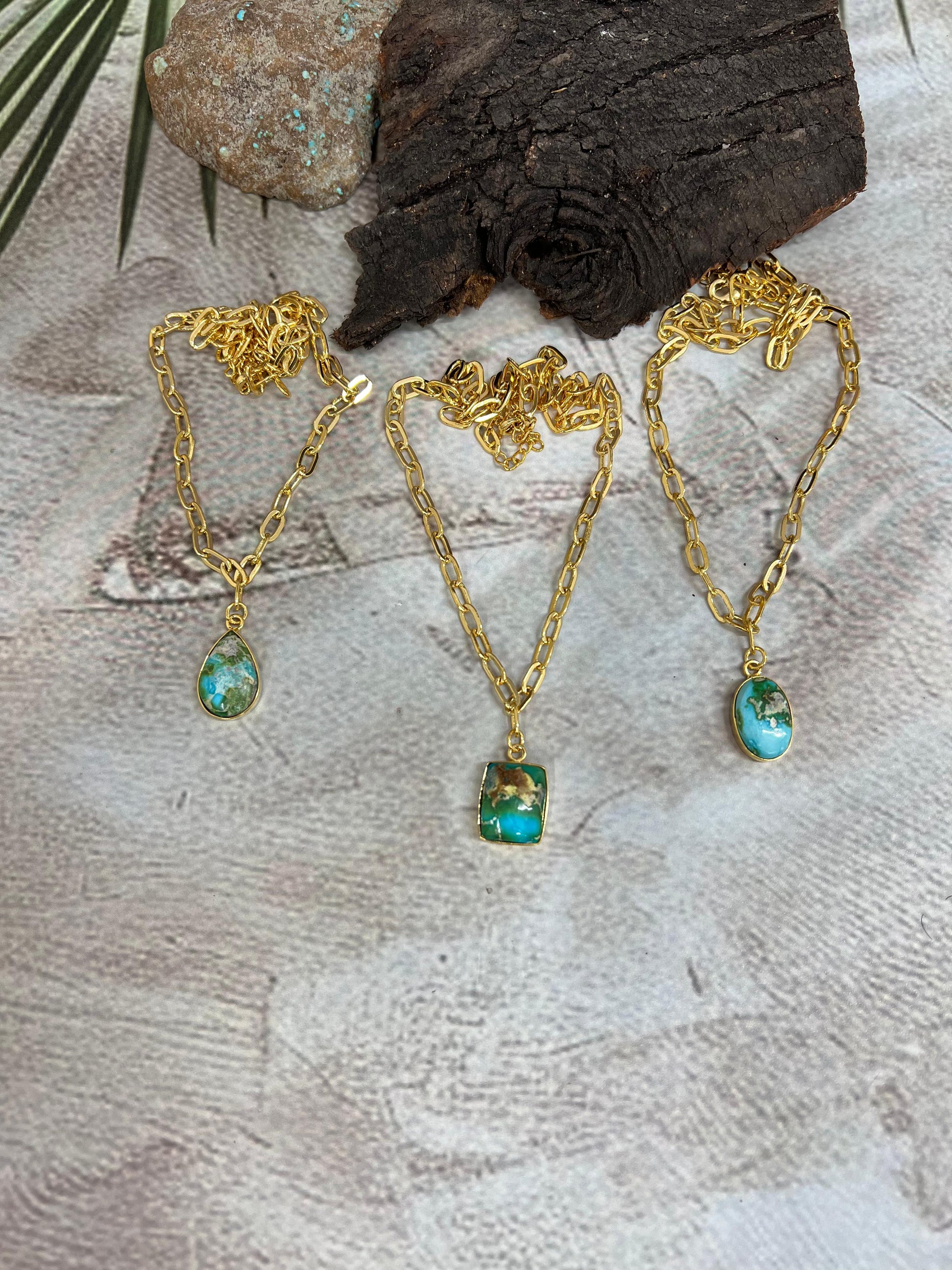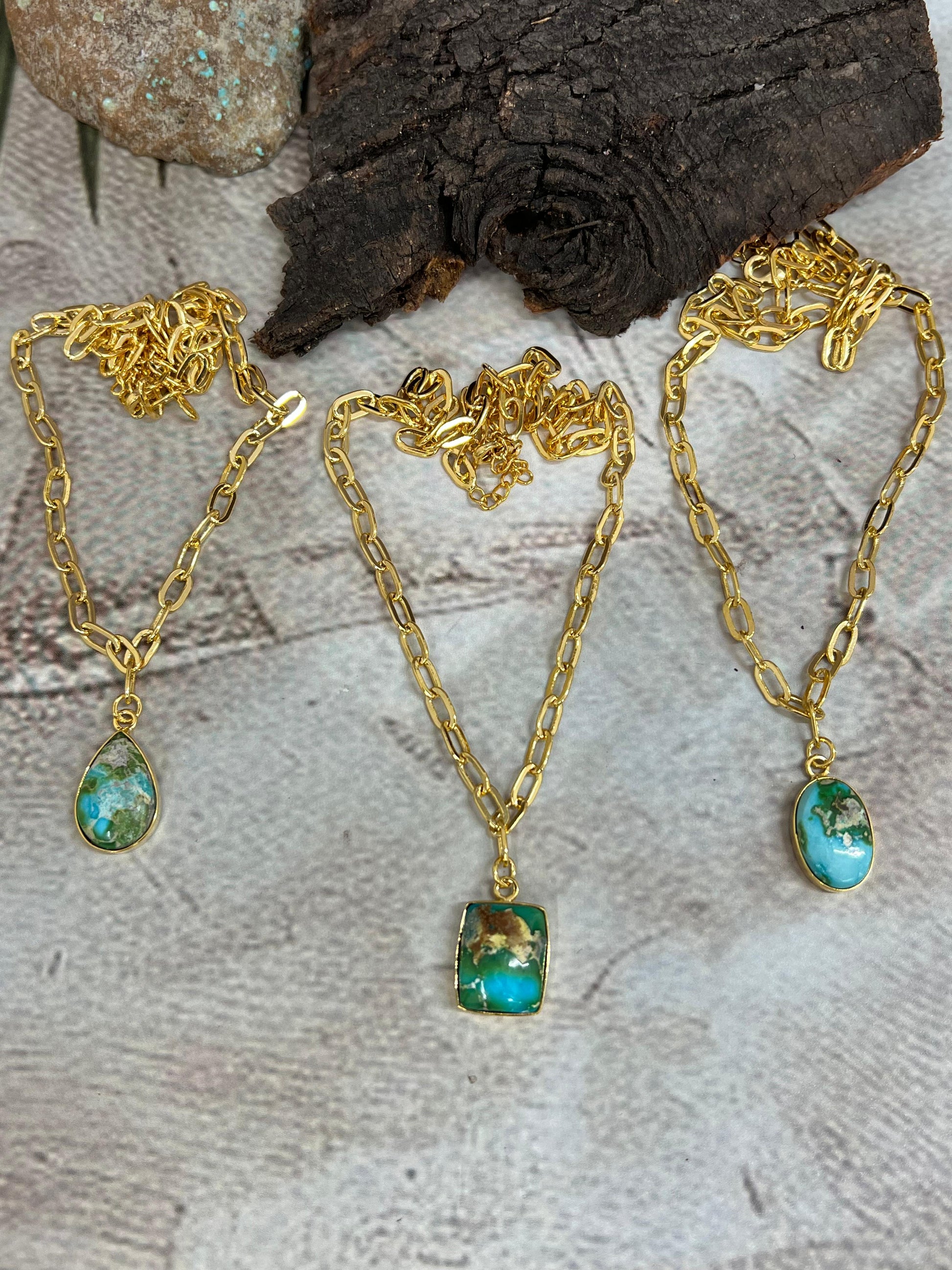 How gorgeous are these Handmade Natural Sonoran Mountain Turquoise Gold Plated Necklace. These are high quality necklaces with beautiful natural stone. These have a beautiful paper clip chain measuring LENGTH 16+2" and WIDTH 3/8".